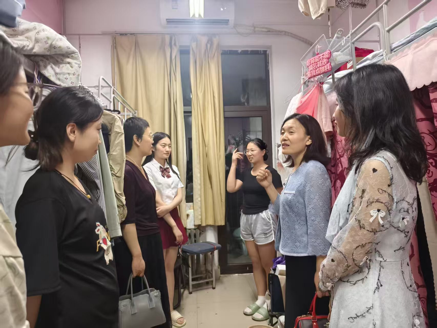 殷殷嘱托暖人心。学院积极搭建毕业生交流沟通平台,6月20日,党委书记张利冰一行走进毕业生宿舍,送上温暖关怀,倾听学生的困惑,分享在职业发展与专业成长等方面的建议,寄语大家常怀感恩之心,传递爱校之情。党委副书记郭娟嘱咐大家践行文明离校,整洁离寝,留存文明与美好。