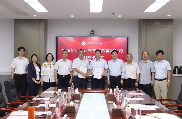 郑文革介绍了河南亿万中元生物技术有限公司的发展历程、经营范围、经营理念。他表示,个人和公司的成长离不开母校辛勤培养,他一直关注和关心母校发展,为母校近年取得的成绩深感自豪。他希望,通过此次捐赠,能够与母校展开更广泛的校企合作,加速产学研进程,将科研成果转化为生产力,达到行业先进水平。