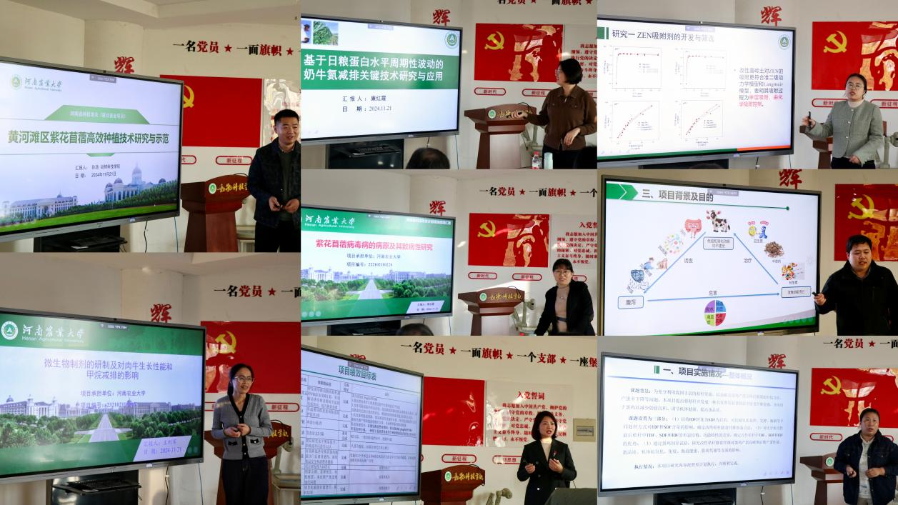 组织有关专家对张薇、孙浩、王平、蒋瑞瑞、郭玉霞、廉红霞、王利军主持的河南省科技攻关项目“玉米赤霉烯酮对仔猪卵泡发育的影响及其脱毒剂的开发与应用(222102110014)”、“黄河滩区紫花苜蓿高效种植技术研究与示范(222103810006)”、“改性秸秆膳食纤维的功能研究及其在蛋鸡生产中的应用(232102111040)”、“脆弱拟杆菌BF839 和复合维生素B 在诱导换羽蛋鸡肠道保健中的作用及其推广应用(232102111042)”、“紫花苜蓿病毒病的病原及其致病性研究(222102110228)”、“基于日粮蛋白水平周期性波动的奶牛氮减排关键技术研究与应用项目(232102110076)”、“微生物制剂的研制及对肉牛生长性能和甲烷减排的影响(232102110103)”及张立阳主持河南省科技研发计划联合基金(应用攻关类)“荷斯坦奶牛乳腺溶菌酶重组表达及对幼龄犊牛肠道免疫功能的调控作用和应用研究”(232103810010)进行了集中结题验收。