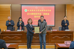 李明代表学院与正大康地集团代表刘利萍签订了“正大康地奖学金、奖教金”捐赠协议。胡明忠代表校教育发展研究会为正大康地集团代表袁冠华颁发了捐赠证书。