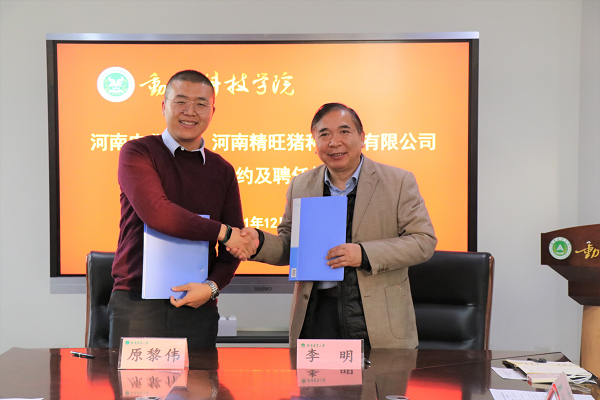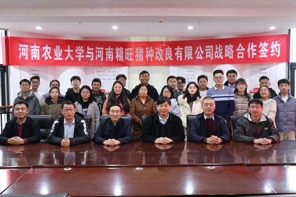 党委书记贾磊、院长李明、副院长付彤、任广志教授、党政办主任李新建及养猪团队师生代表参加了签约仪式。