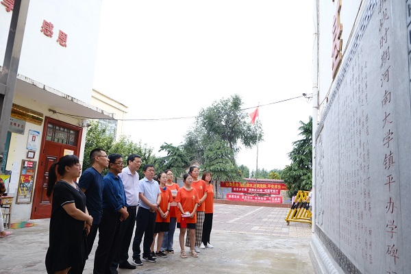 督导王成章、团委书记韩笑、青年教师马森等师生一行10余人组成的“重走办学路”实践团队抵达南阳市镇平县安国城遗址(今安国小学),回望来时路,愈彰为农志。