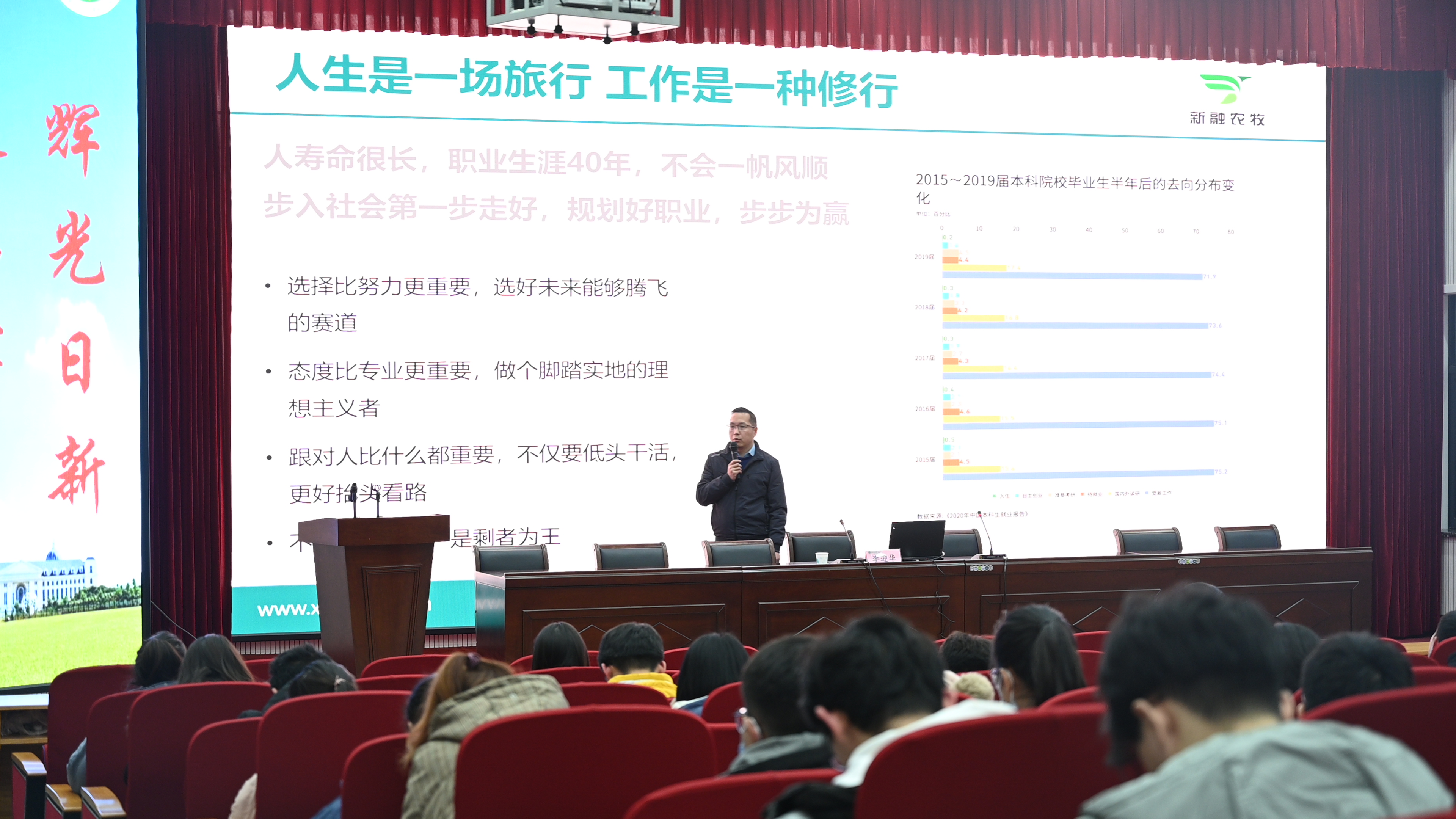 李迎华以《养猪业发展大变革 引各路英雄逞英豪》为题,以个人经历为引,介绍了当今大学生就业现状。他就当今大学生内卷化严重、收入倒挂等几个突出问题,提出了早就业的建议;从选择比努力更重要,态度比专业更重要,“剩”者为王三个方面做出具体就业指导。他还通过对十年前和当今就业形势的对比分析,辅以时间轴推进,指出近年养猪行业已发生巨大的变革,嘱咐同学们一定要选好“赛道”,只有脚踏实地的努力学习,才能获得更长久的发展,不管在任何行业,只有坚持才能有所成就。