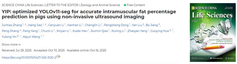 王克君教授团队、中国科学院亚热带农业生态研究所印遇龙院士团队等,在国际知名期刊《SCIENCE CHINA Life Sciences》(中科院一区TOP,IF = 9.5)发表题为“YIP: optimized YOLOv11-seg for accurate intramuscular fat percentage prediction in pigs using non-invasive ultrasound imaging”的研究成果。该研究开发了一个基于无损B超影像高效精准预测猪肌内脂肪含量的AI模型,准确性达到95%以上。