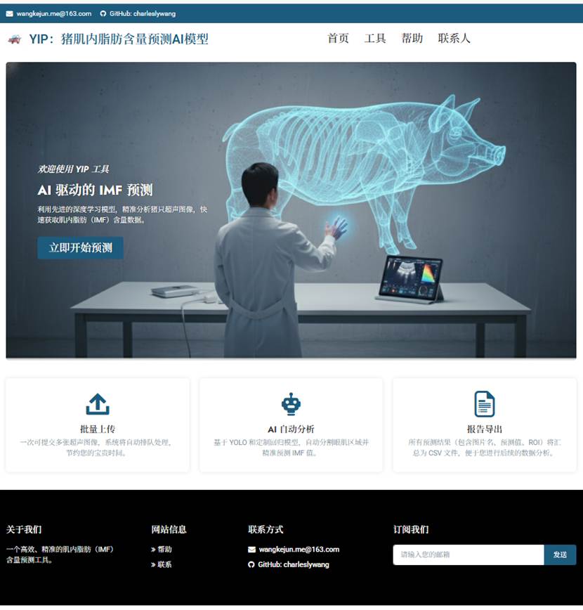 为了便于YIP模型广泛应用于育种和生产实践,研究团队还开发了一站式web平台,用户仅需上传超声图像,即可快速获得IMF预测值。有效地将传统上耗时、昂贵且具有破坏性的实验室分析流程,转变为一个即时、无创的线上自动化分析过程,显著轻简了操作流程、降低了选育成本。