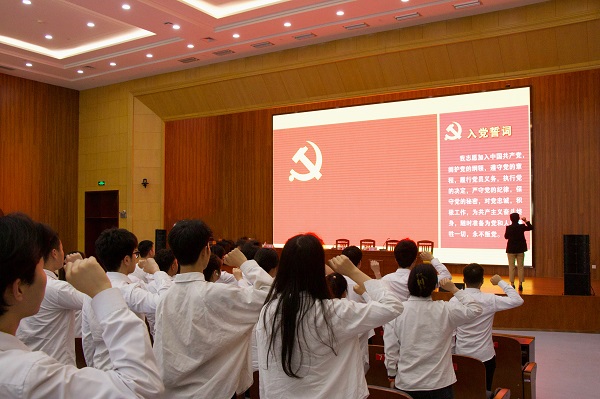 会议在庄严的《国际歌》中拉开帷幕,李明宣读56名新党员名单,郭娟带领新党员进行庄严宣誓。21级水产一班黄文洋作为新党员代表发言,表达了作为一名共产党员的责任感和使命感,以及愿意为党的事业奋斗终身的坚定理想信念;22级动产六班霍梦瀛作为入党积极分子代表发言,表示将以党员同志为榜样,坚定永远跟党走,积极向党组织靠拢,争取早日加入党组织。