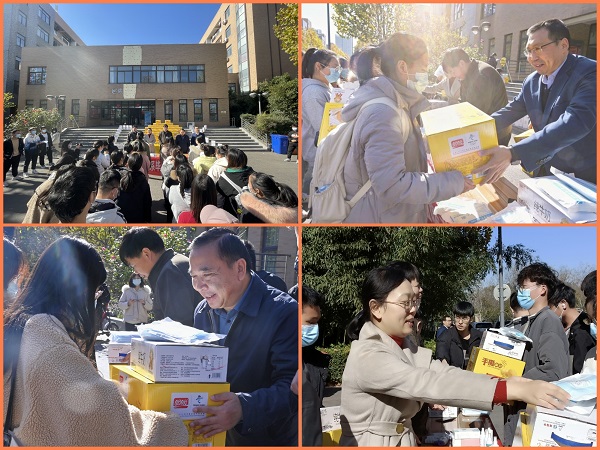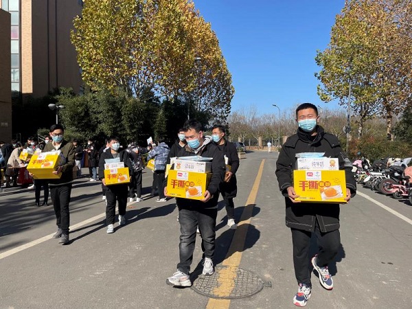 学院到场领导老师依次为全体学生送上长者关怀和师者祝福,鼓励和祝福大家满怀信心、攻坚克难、坚持到底、心想事成,并为毕业生每人送上一箱牛奶、一箱面包、两包口罩,带来冬日的一份温暖。