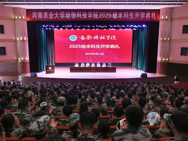 于文化路校区大礼堂举行2025级本科生开学典礼,院党委书记张利冰、院长李明、农大牧原联合产业研究院执行院长兼学院副院长付彤、党委副书记郭娟、副院长酒梅菊、农大牧原联合产业研究院副院长蒋瑞瑞、校友代表刘金萍出席典礼,全体新生班主任、辅导员及新生参加活动。活动由郭娟主持。