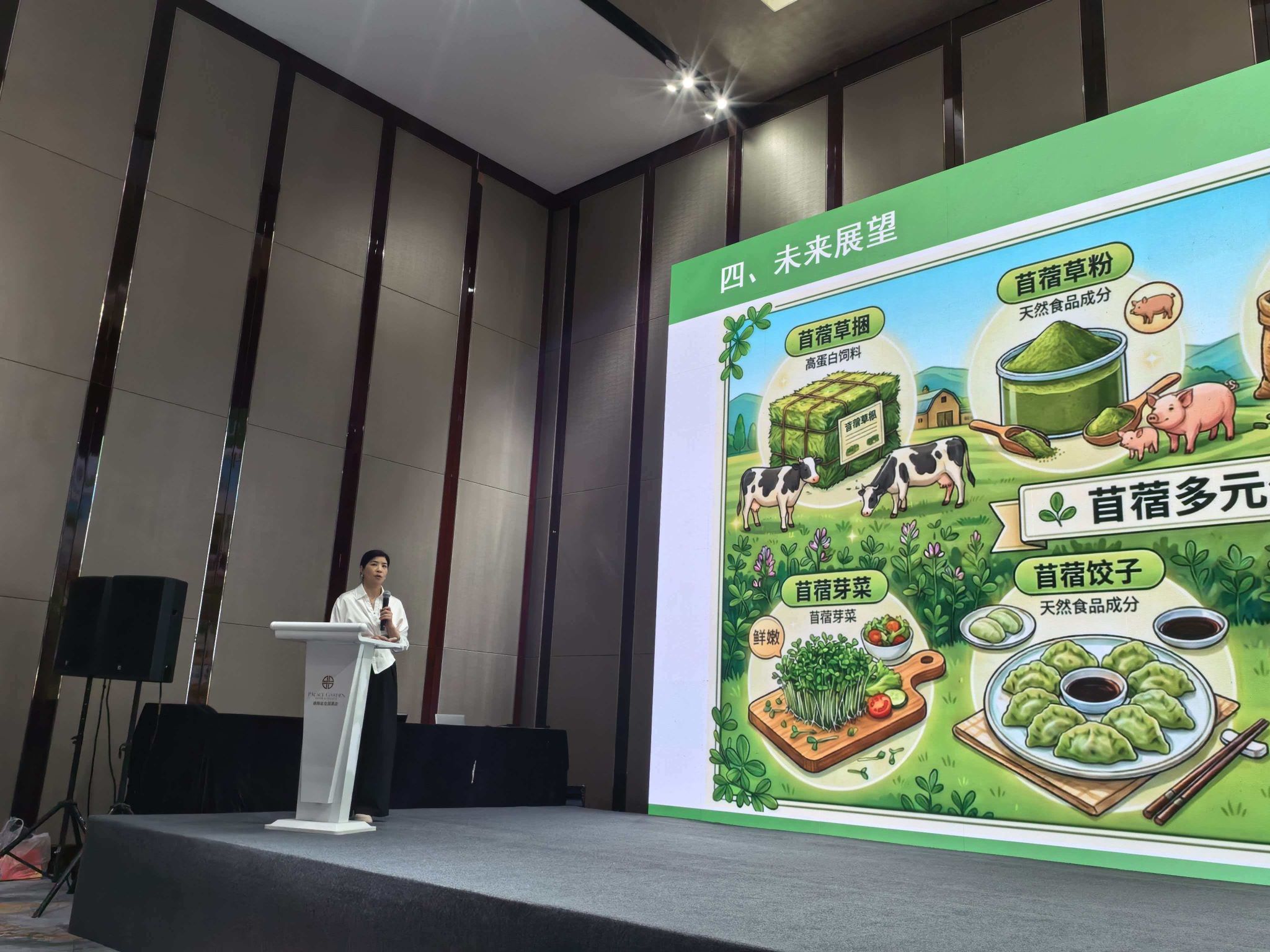 师生积极参会交流,科研成果亮点突出。史莹华教授受邀在专题分会场作题为《苜蓿深加工草产品的开发利用》主题报告,详细介绍苜蓿功能性成分提取技术与应用成效,阐明苜蓿产品在绿色饲料、特医食品领域的发展潜力,为饲草产业提质增效、精深加工产业发展提供理论参考与实践思路。
