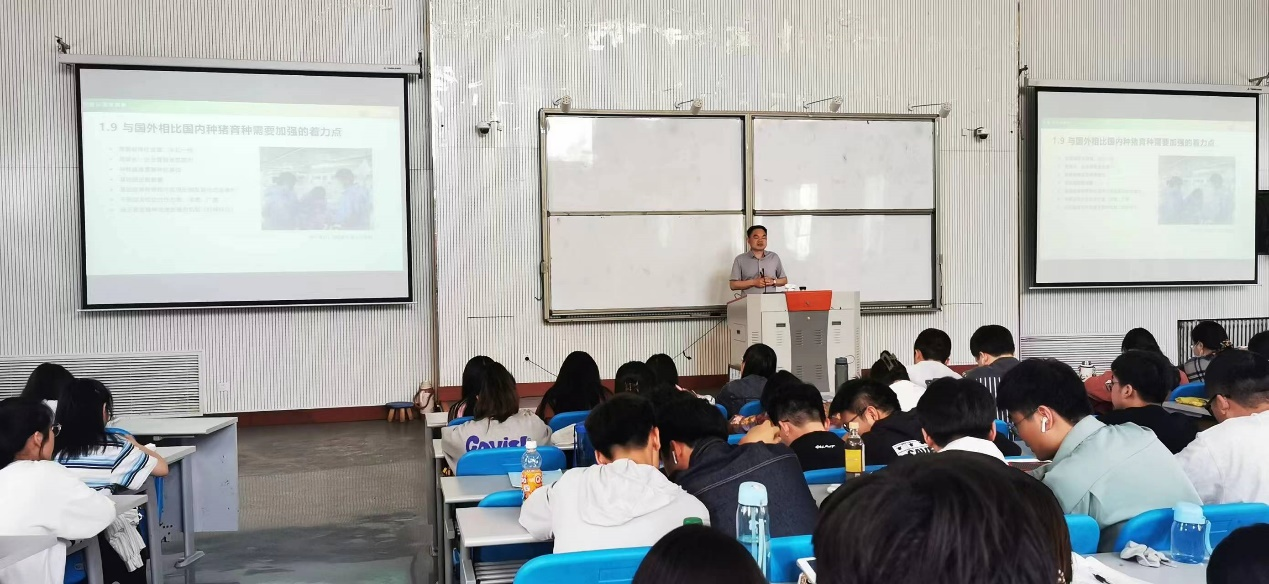 索跃敏以《匠心育种,赋能产业》为主题,从养殖行业目前面临的现状入口,深度分析目前行业发展现状及面临的问题,他还向我们详细的讲述了目前他们在育种工作中取得的成绩,育种思路,以及育种工作的价值和意义;为了让同学们更好的了解猪群在猪舍的详细情况,他还在课堂上现场打开猪舍内的监控,让同学们实时观看到现代化养猪场现金设备的运行情况及猪群实时的生活状况;他还从育种新技术、人才培养等方面详细地向同学们介绍行业对大学生的需求。最后,他鼓励大家要传递服务行业的正能量,认真学习,把自己学到的专业知识和想法贯穿进育种行业中去,为育种事业贡献一份自己的力量。